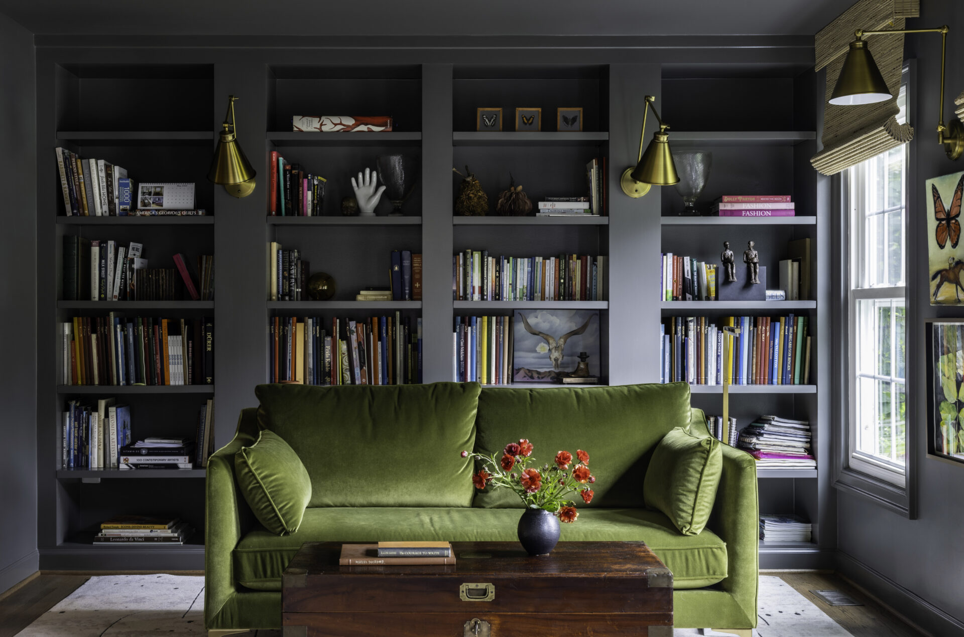 For example, in the photo to the right, the color of the built-ins/walls in the living room matches the color of the kitchen cabinets shown above, which creates visual harmony. A wall between them was removed, yes, but the design stopped short of full open-concept. Instead, we created a sight-line that allows the two spaces to connect while remaining defined. The added bonus is that this allows natural light to flow from one side of the house to the other, while preserving a cozy aesthetic.