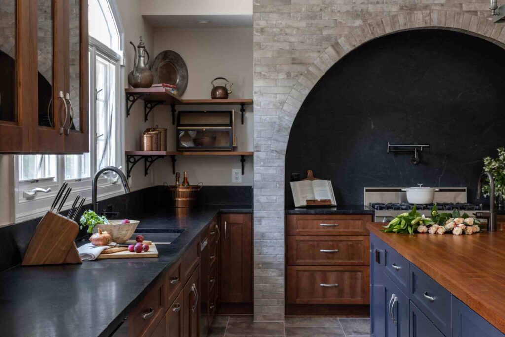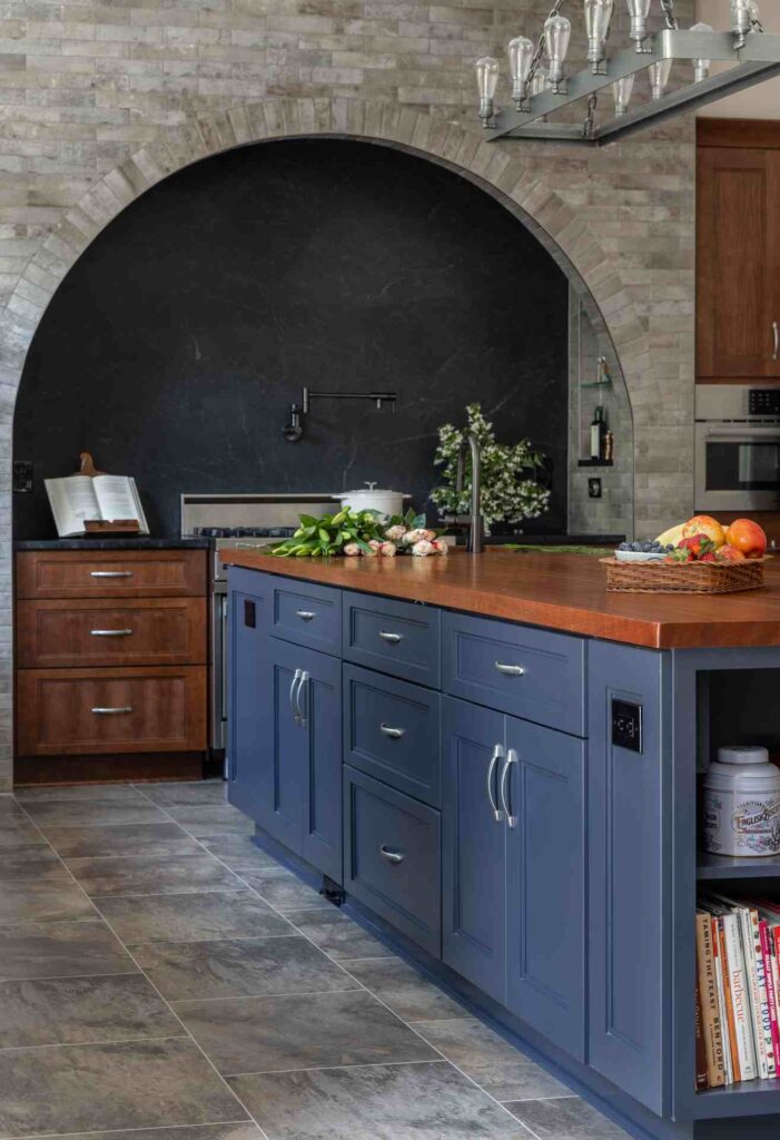 The expansive kitchen features Showplace cabinetry, with a bold Hale Navy island in a paint-grade finish paired with Cherry perimeter cabinets in Pecan satin. The Virginia Mist honed granite countertops add timeless sophistication, while the Sapele wood island top and matching L-shaped shelves bring organic texture and contrast.