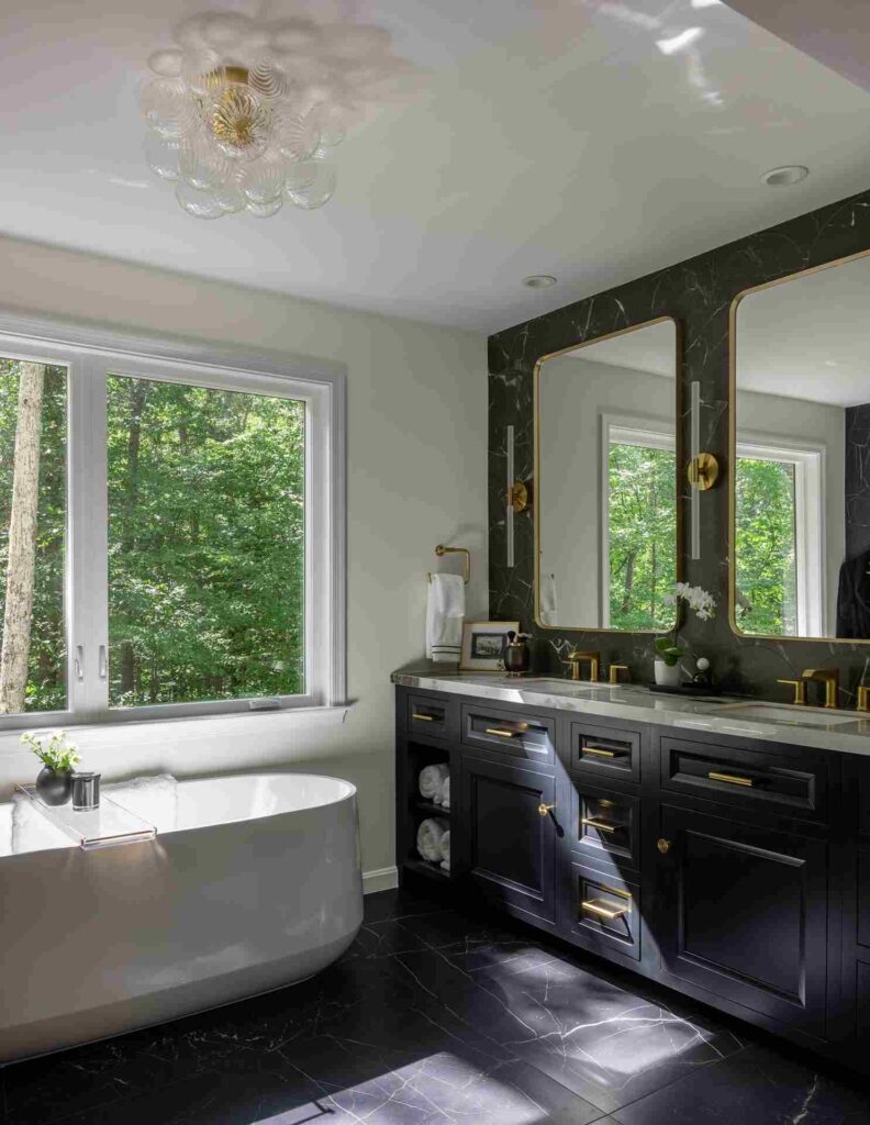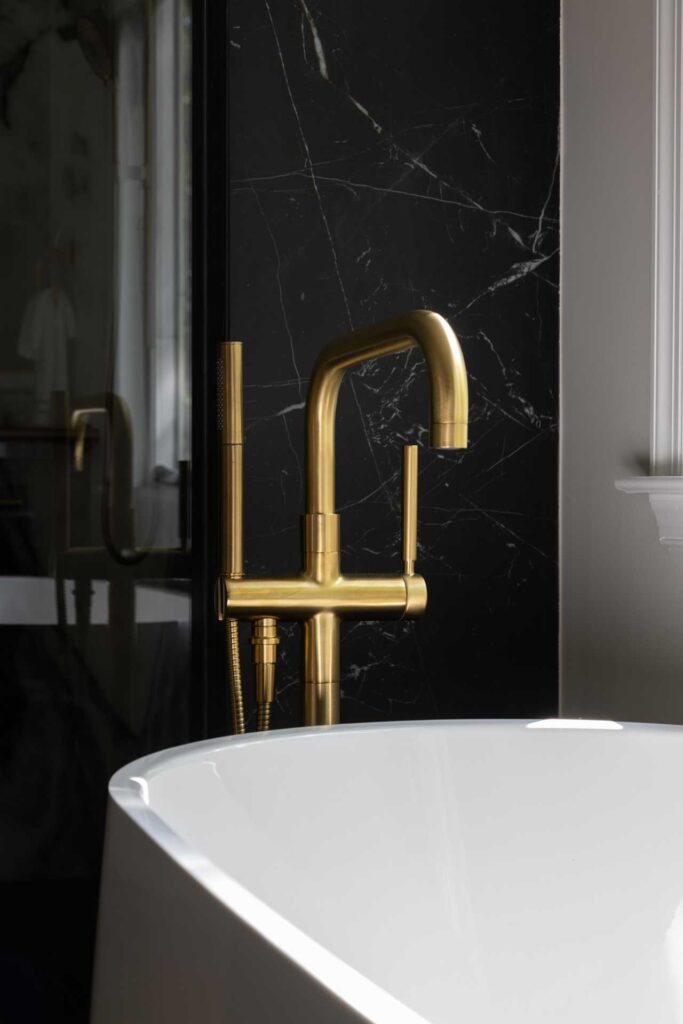 Elegant Vibrant Brushed Moderne Brass fixtures by Kohler bring warmth throughout the space—from the Hint widespread faucets to the Purist shower components and Ceric freestanding soaking tub. Every detail, including the brushed brass trim and accents, was carefully chosen to complement the overall design palette.
