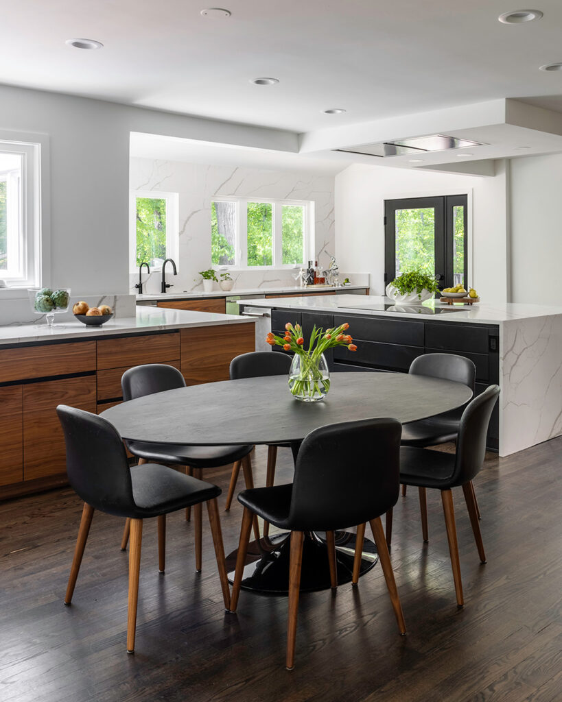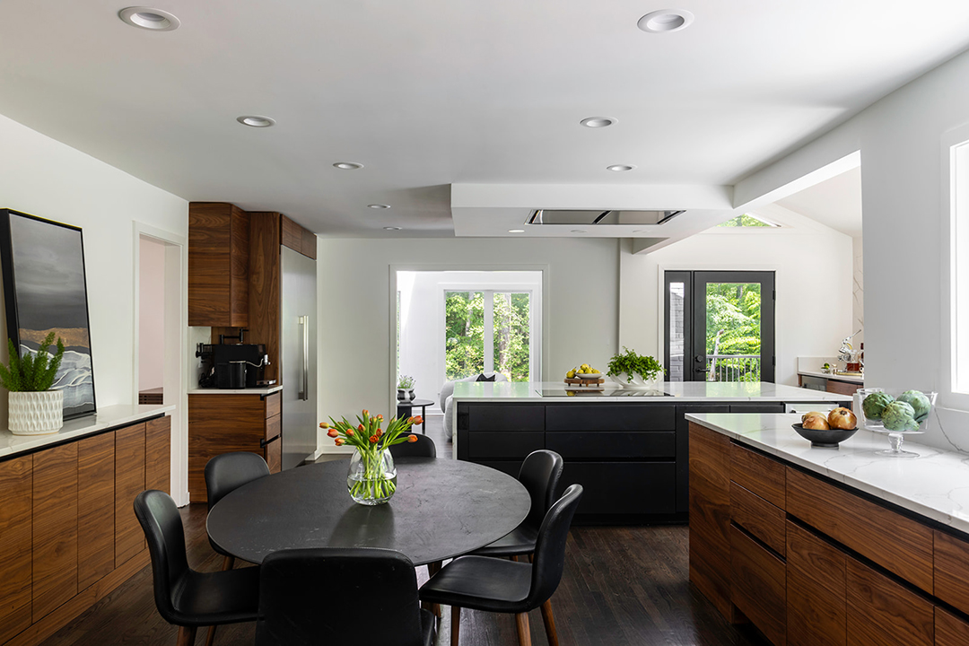 This luxury kitchen remodel in McLean, VA started with a simple goal: create a space that felt open, inviting, and perfectly suited for both casual mornings and elegant evenings with friends. The original kitchen was closed off and lacked the connection to the outdoors that the homeowners craved. By reimagining the layout, we introduced a dramatic quartz waterfall island as the centerpiece, paired with rich custom walnut cabinetry that adds warmth and sophistication.