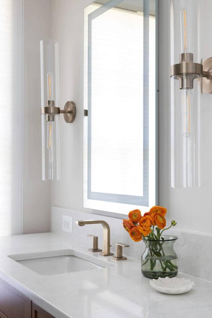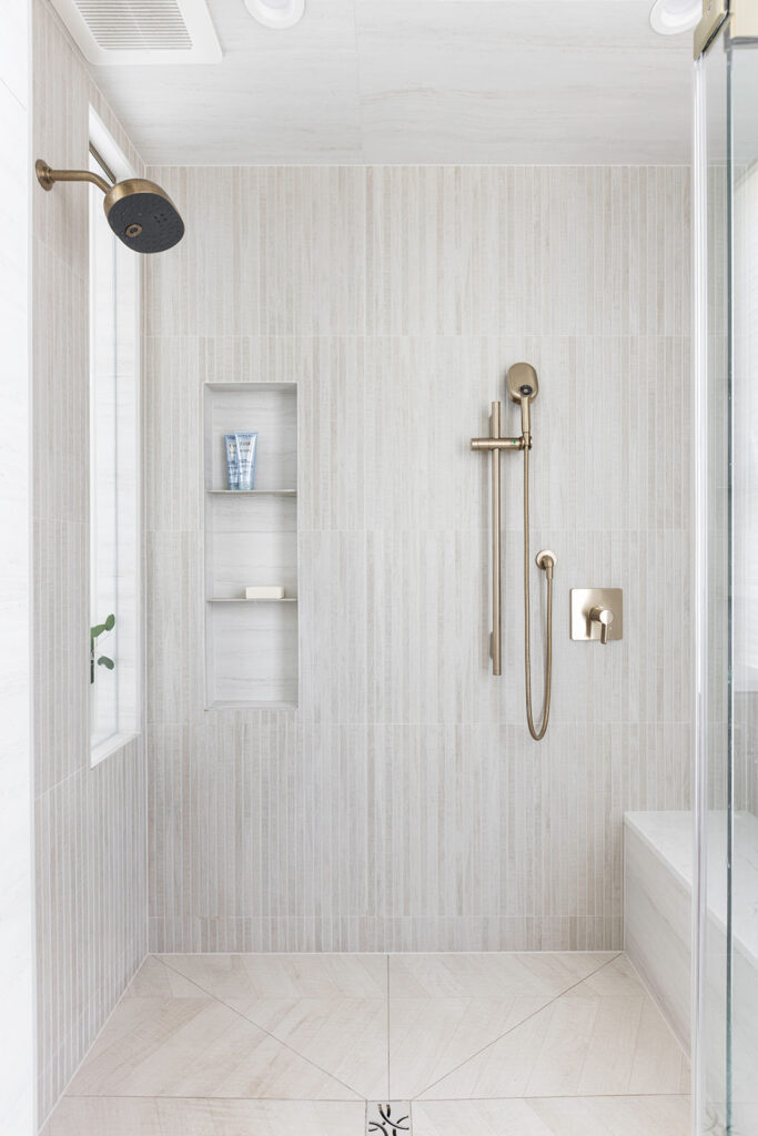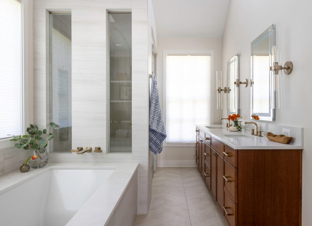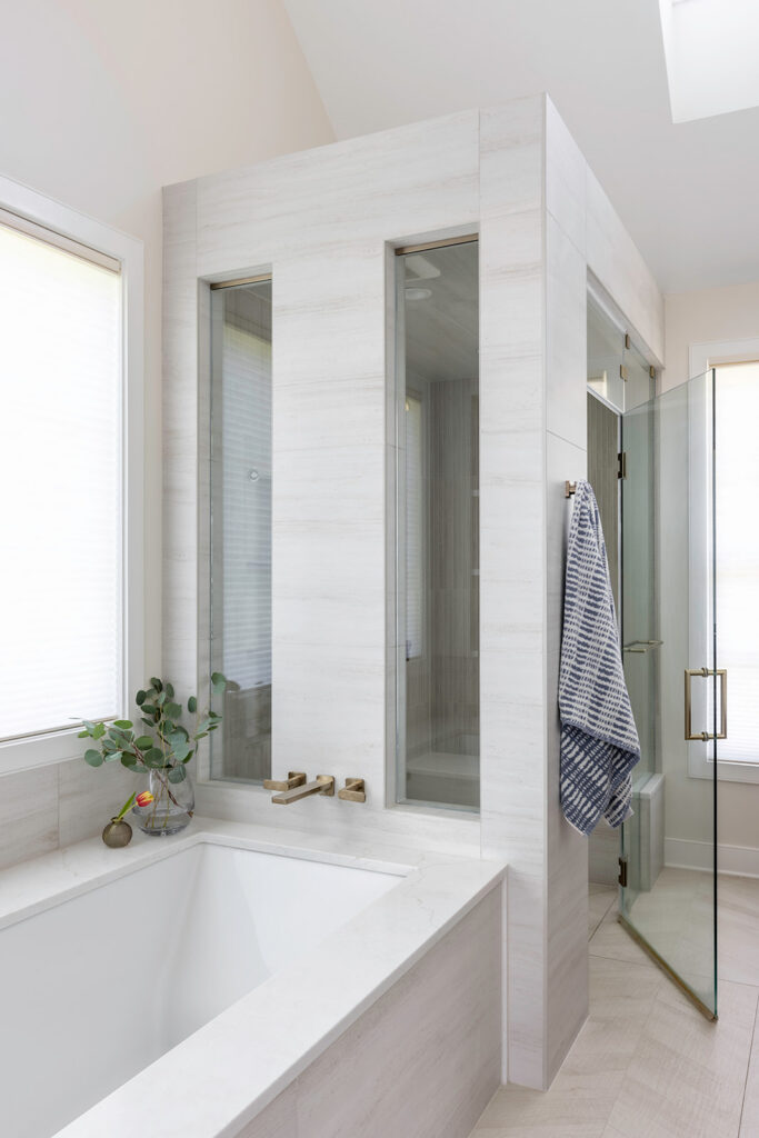 Radiant heated floors, lighted mirrors, and brushed bronze fixtures from Kohler enhance daily comfort, while a reconfigured adjacent space made room for a private water closet, linen storage, and laundry area.