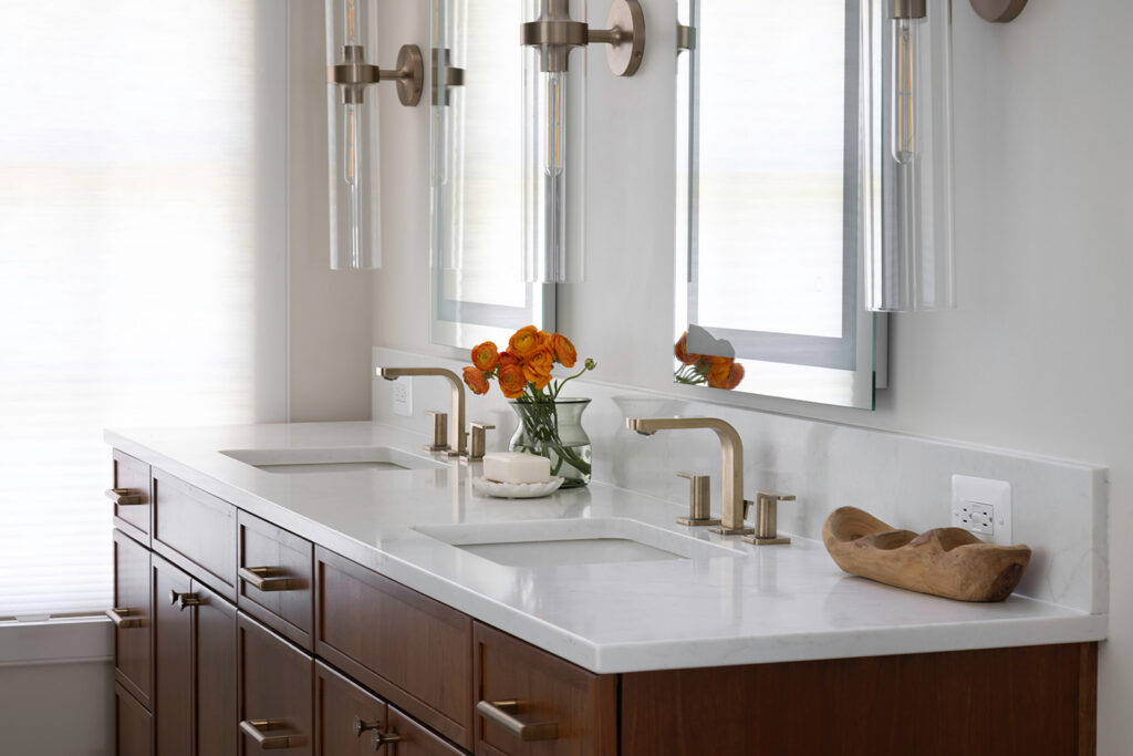 The shower was expanded and repositioned with glass panels that allow daylight from a new window above the tub to filter through, while the bathtub was relocated to create a balanced focal point. A cherry vanity by Crystal in a warm Toasted Rye finish pairs with Lavasa quartz surfaces from MSI Q Quartz, adding warmth and durability.