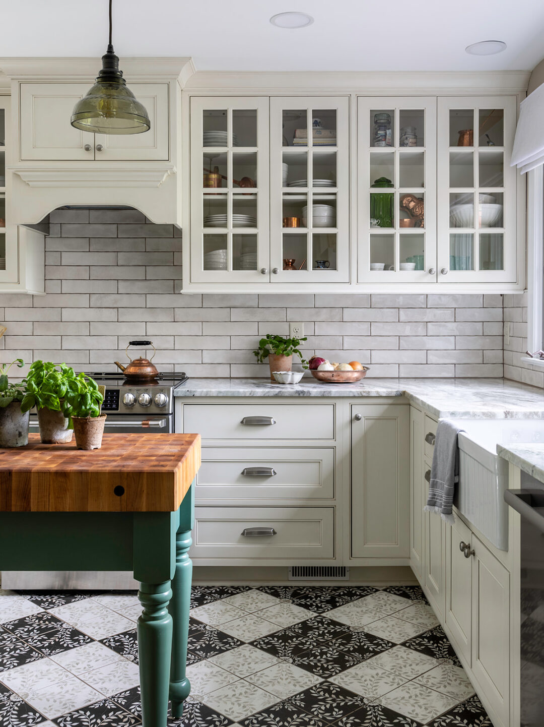 Beaded inset Shiloh cabinetry in a soft white maple finish sets a timeless foundation, paired with a mix of glass-front and solid doors to showcase family heirlooms while maintaining ample storage. Checkerboard-patterned flooring anchors the space, while Fantasy Brown marble countertops and a subtly textured backsplash add warmth and visual interest. Modern appliances were integrated seamlessly into the classic farmhouse aesthetic.